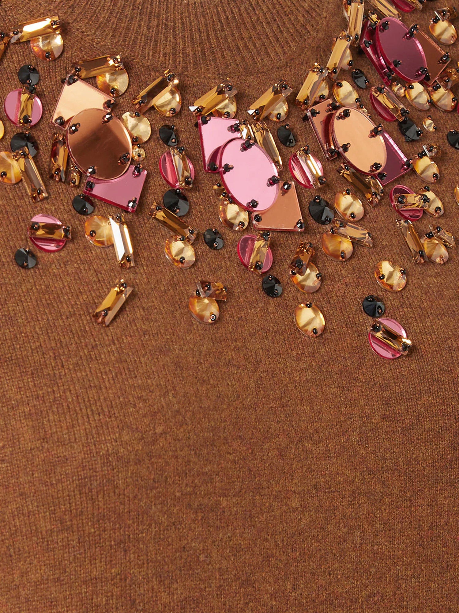 - Three-dimensional embroidery with sequins, microbeads, and mirrored appliqués