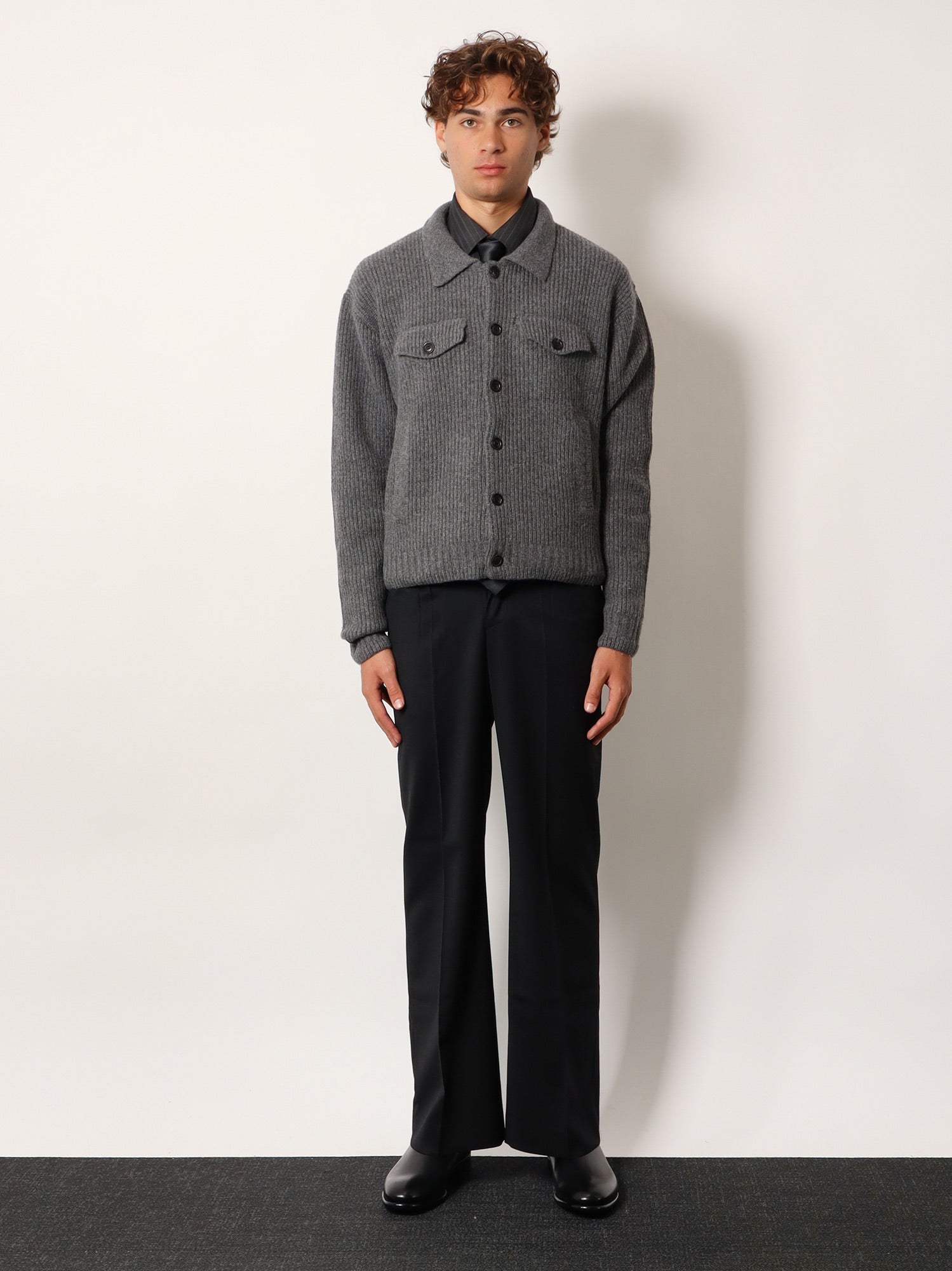 - Button closure and pointed collar