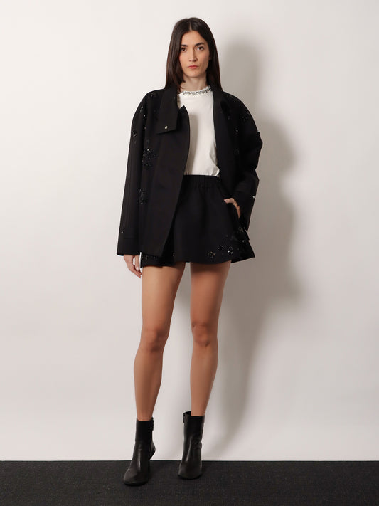Produttore:GOLDEN GOOSE DELUXE BRANDGiacca in black denim con dettagli floreali in paillettes e cristalli
