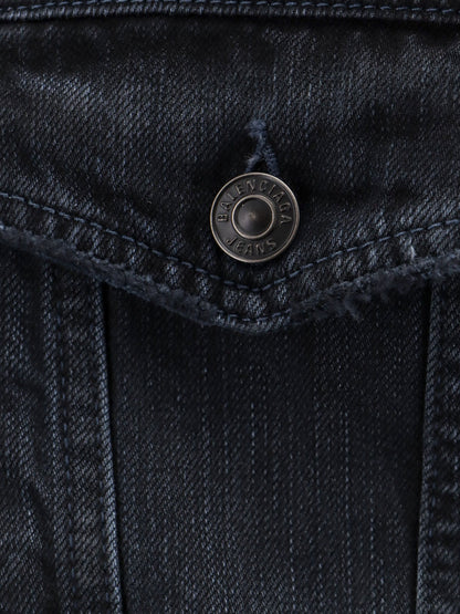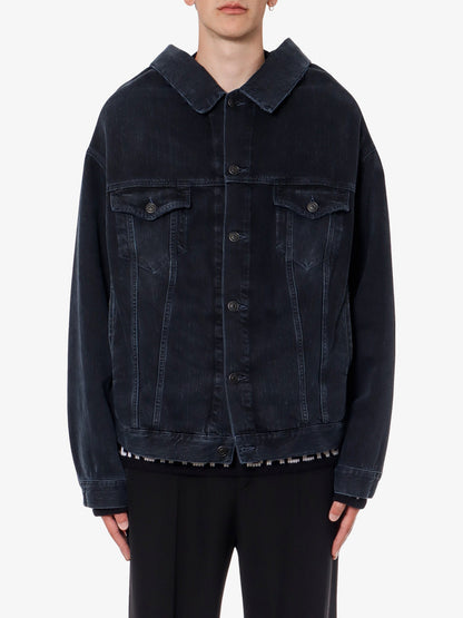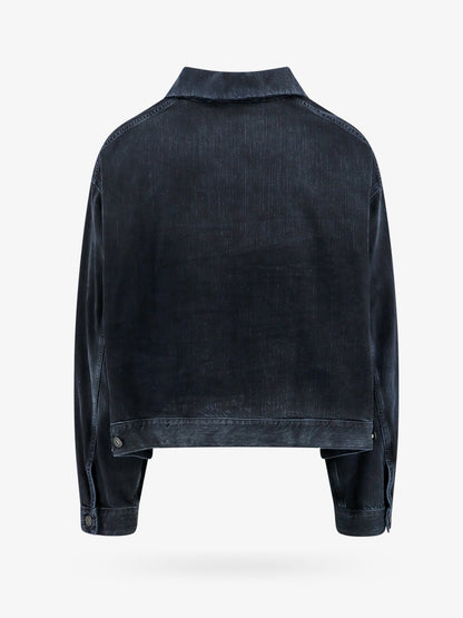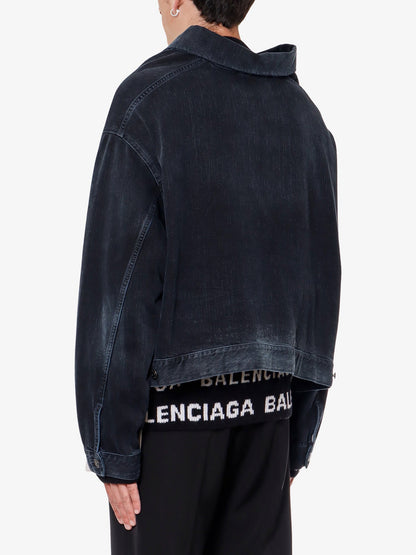Denim off shoulder jacket with logoed buttons