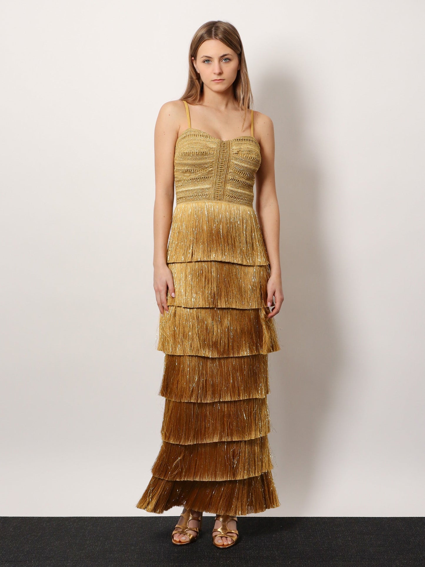 Long dress with embroidered courset and fringes